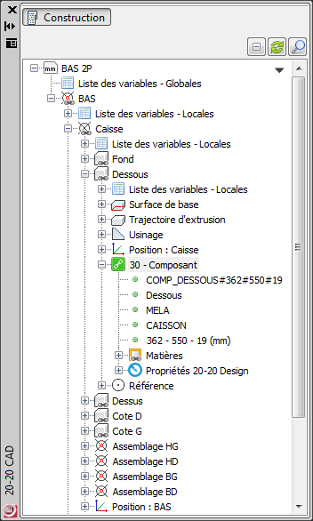 L'arbre de construction représente la hiérarchie de votre dessin. Celui-ci permet d'organiser son dessin, d'ajouter ou de supprimer des options sur les éléments qu'il contient.