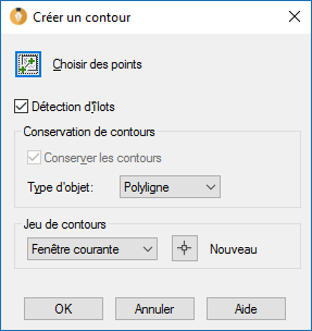 Pour créer un jeu de contours à partir de tous les objets visibles dans la fenêtre courante, choisissez Fenêtre courante. Evitez cette option lorsqu'il s'agit de dessins grands et complexes.