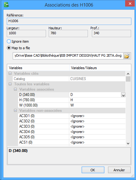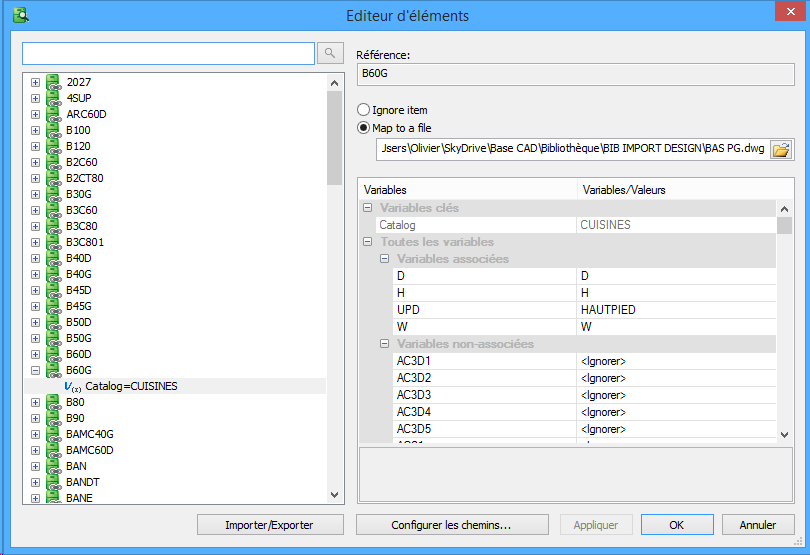 Par exemple un B30G correspond à un BAS porte gauche. Si dessin utilisé permet le changement de porte, il suffira d’insérer la variable correspondante et indiquer la valeur pour une porte gauche. Ainsi le dessin final qui sera insérer aura une porte gauche.