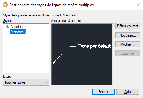 L'apparence d'une ligne de repère est déterminée par le style de ligne de repère multiple qui lui est appliqué. Vous pouvez utiliser le style de ligne de repère multiple par défaut, STANDARD, ou créer vos propres styles de ligne de repère multiple.