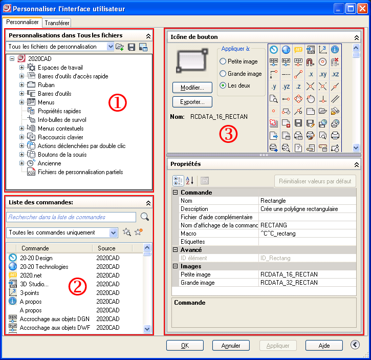 Lorsque vous sélectionnez une commande, vous devriez voir le panneau de droite (3) mis à jour et afficher les propriétés de la commande. Vous pouvez changer l’icône du bouton, le nom de la commande, et la macro qui sera exécutée lorsque vous cliquez sur le bouton. C'est ici que vous définissez les propriétés de commandes, des panneaux, des onglets et d'autres éléments.