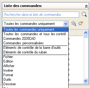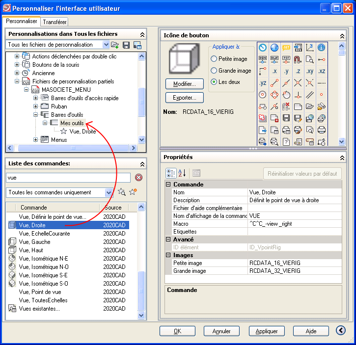 Placer des commandes dans une barre d’outils est facile. Retourner dans le menu 20-20 CAD en sélectionnant Tous les fichiers de personnalisation dans le liste déroulante. Développez l’arbre jusqu’à Fichier de personnalisation partielle puis jusqu’à votre barre d’outil. Et faites glisser vos commandes sur votre barre d'outils personnalisée.