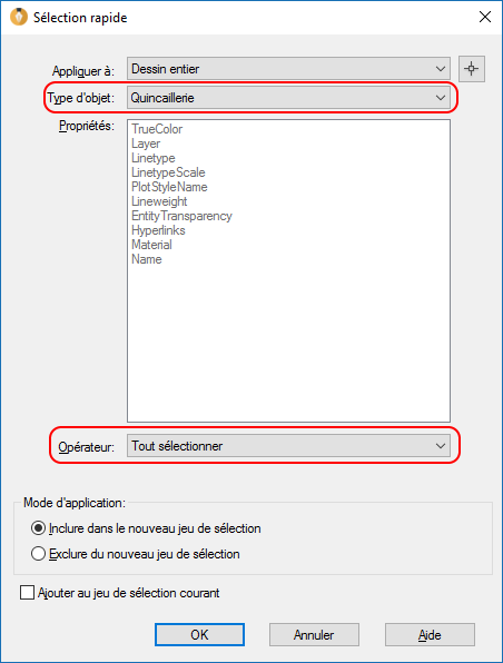 Sélectionner toutes les quincailleries du dessin courant