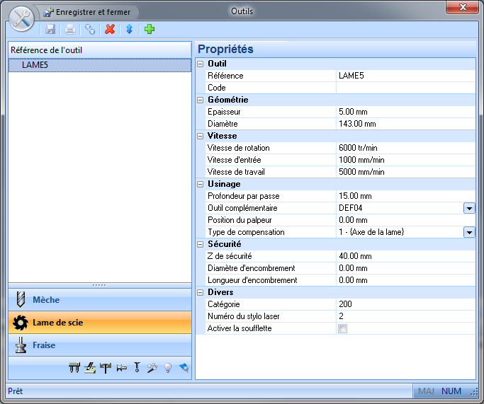 MENU : Configuration » Outil » Lame de scie